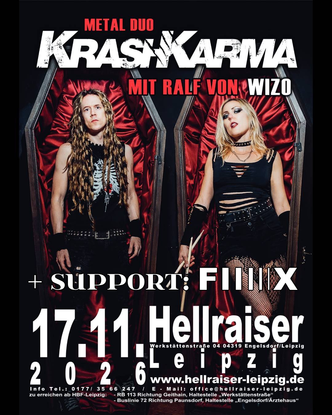 Mit über 800 Konzerten weltweit haben sie sich international einen starken Ruf als kompromissloser Live-Act erspielt. Im September 2026 erscheint ihr neues Album ENTER THE EXIT. Direkt im Anschluss gehen KRASHKARMA im Oktober und November auf große Europatour.