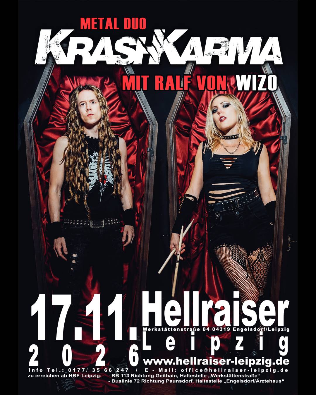 Das Metal-Duo aus Los Angeles (mit Ralf von WIZO) steht für explosive Live-Shows, extreme Energie und einen Sound, der weit über die Besetzung hinausgeht.